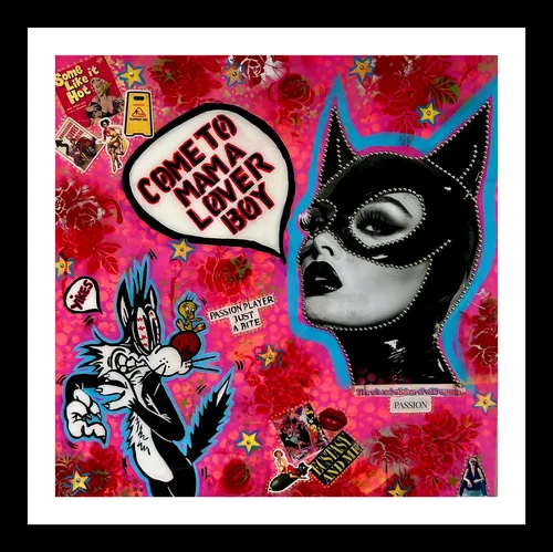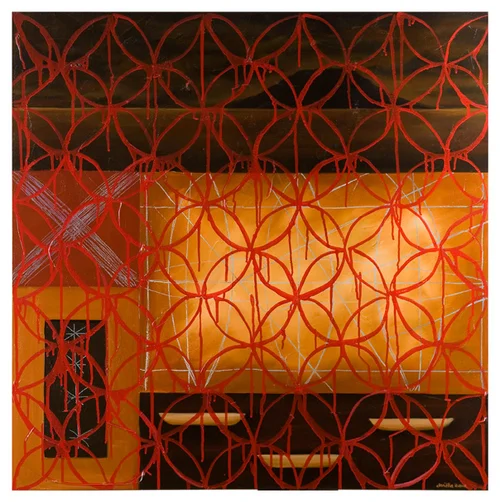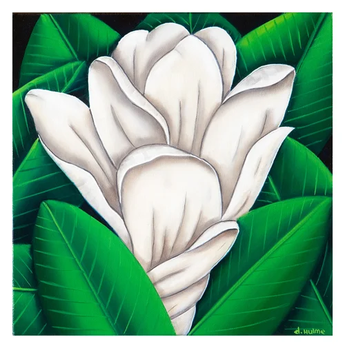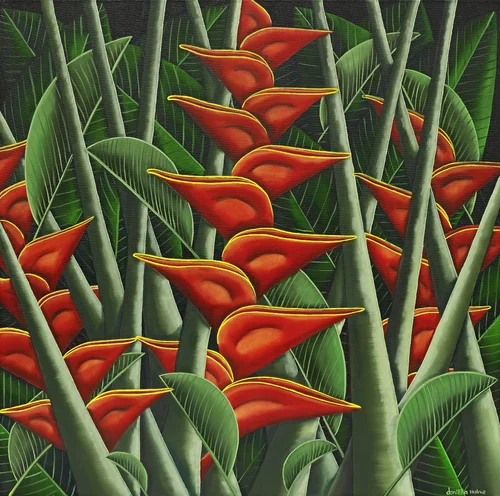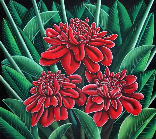 Brilliant tropical flowers and fabrics in their simple settings pay homage to a Pacific tradition but are rendered to an exaggerated almost kitsch resolution. With lipstick-red mouths and stiff limbs the figures appear doll-like, contained and carefully poised in their plasticized worlds, adding a touch of unease to the Pacific paradise. Daniëlla prompts the viewer to consider surface in terms of paint and cultural perception; the island escape, the island beauty.